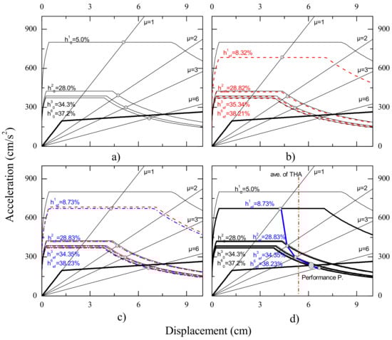 - The final performance points were connected and the point of intersection of the formed curve (blue solid line in Figure 4d) with the capacity curve was defined as the ultimate performance point of the ESDOF;