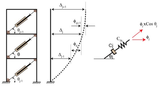 Where the oil dampers were arranged in a diagonal scheme with the inclination angle, θ, for an MDOF system as illustrated in Figure 5, the Equations (4) and (5) can be used to incorporate the oil damper distribution along the building height, as follows: