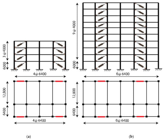 Steel buildings, both 4-story and 10-story, were selected from the JSSI manual [17,31]. The buildings were designed as steel moment-resisting frames to resist the gravity loads, while oil dampers were considered to control the response under the earthquake ground motion. The plans and elevations of the buildings are shown in Figure 6. The ground floor height is 6 m, and the typical floor height is 4 m for both target buildings. The sizes of columns and beams are summarized in Table 3 and Table 4.