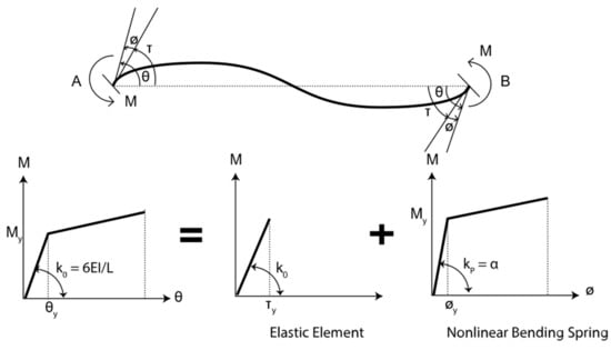 The 3D frame models of the buildings were analyzed by STERA_3D software, which is a finite element-based program developed by one of the authors [32]. In the model, the steel beam element is presented by a line element with two nonlinear flexural springs at both ends, as shown in Figure 7. The steel column element is presented by a line element with nonlinear axial springs in both end sections to consider nonlinear axial-moment interaction. The steelstrength was modified 1.1 times more than the nominal strength, and the ratio of post-yield stiffness was γ = K0/Ky = 0.001. The slab effects required to amplify the flexural stiffness of the steel beam were assumed to be 1.2. The floor slab was considered to be rigid for in-plane deformation, and free for out-of-plane deformation. The beam–column connection was assumed to be rigid, where the rigid zone length for the beam element was set to be half of the column width.