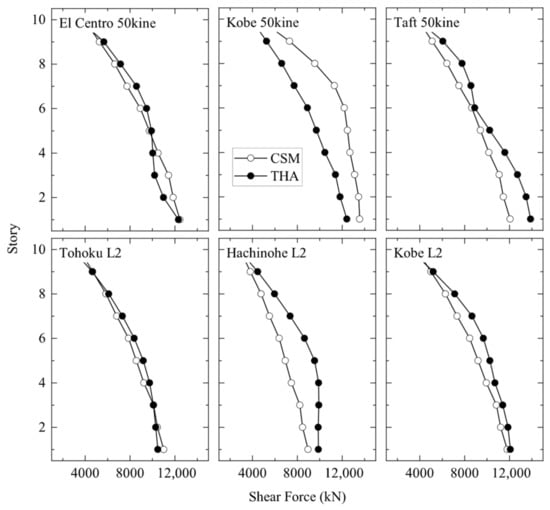 The maximum responses of the target buildings under the earthquake ground motions were estimated by the proposed CSM, and compared with the results of nonlinear THA. Figure 11, Figure 12, Figure 13 and Figure 14 show the story drifts and story shear forces obtained by the proposed CSM and the nonlinear THA for the selected ground motions along the height of the target buildings.