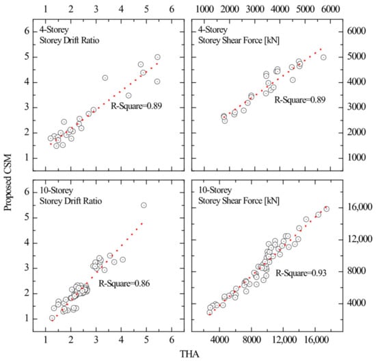 Story drift and shear force correlation of the proposed CSM and nonlinear THA for 4- and 10-story steel buildings.