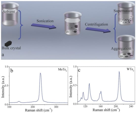 (a) Schematic diagram of a liquid exfoliation method for preparing MoTe2/WTe2 nanosheets. Raman spectra of (b) bulk MoTe2 and (c) bulk WTe2. Reprinted with permission from [49].