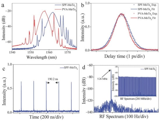 Results of the WTe2 mode-locked fiber lasers. (a) Spectrum, (b) autocorrelation trace, (c) pulse train and (d) RF spectrum. Reprinted with permission from [49].