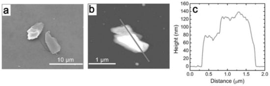 (a) Scanning electron microscope image and (b) atomic force microscopy image of the prepared WTe2 microflakes on a glass substrate. (c) The height profile measured along the red line in (b). Reprinted with permission from [33].