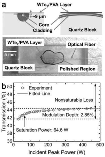 To fabricate a WTe2 SA fiber module, the WTe2 solution was mixed with PVA and dropped on the surface of a side-polished fiber. The dimension of the WTe2-PVA film was about 10 mm × 9 mm and its thickness was measured as 2.3 μm using a surface profiler (DetakXP Stylus Profiler, Bruker). The optical transmission curve of the WTe2-PVA deposited SA module was obtained using the input of a 1-ps mode-locked pulsed lasers with a wavelength of 1550 nm and a repetition rate of 14.15 MHz (Figure 6). This transmission curve was fitted to following formula for quantitative SA characterization [52].