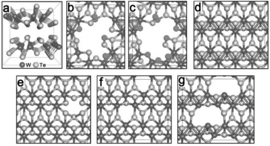 Atomic structures of (a) bulk WTe2, (b) 1 L W8Te18O5 (W:Te = 1:2.25), (c) 1 L W8Te14O9 (W:Te = 1:1.75), (d) 1 L W16Te32 (W:Te = 1:2), (e) 1 L W15Te32 (W:Te = 1:2.13), (f) 1 L W16Te30 (W:Te = 1:1.875) and (g) 1 L W16Te26 (W:Te = 1:1.625). Tungsten, tellurium and oxygen are shown in dark two-tone gray, light-two-tone gray and dark one-tone gray, respectively. Reprinted with permission from [33].