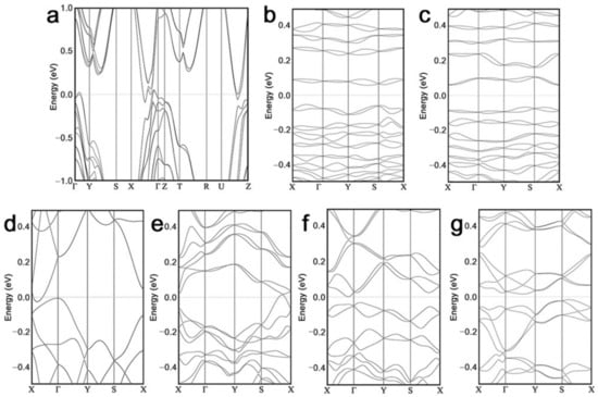 Electronic band structures of (a) bulk WTe2, (b) 1 L W8Te18O5 (W:Te = 1:2.25), (c) 1 L W8Te14O9 (W:Te = 1.75), (d) 1 L W16Te32 (W:Te = 1:2), (e) 1 L W15Te32 (W:Te = 1:2.13), (f) 1 L W16Te30 (W:Te = 1:1.875) and (g) 1 L W16Te26 (W:Te = 1:1.625). Reprinted with permission from [33].