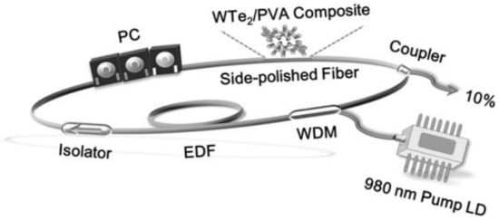 The schematic of the ring-cavity erbium-doped fiber laser incorporating the WTe2 microflake-based saturable absorber (SA). Here, polarization controller (PC), Er-doped fiber (EDF), wavelength division multiplexing (WDM) and laser diode (LD) denote a polarization controller, an Er-doped fiber, a wavelength division multiplexing and a laser diode, respectively. Reprinted with permission from [33].