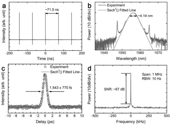 Measured (a) oscilloscope trace, (b) optical spectrum, (c) autocorrelation trace and (d) electrical spectrum of the output optical pulses (SNR: signal-to-noise ratio, RBW: resolution bandwidth). Reprinted with permission from [33].