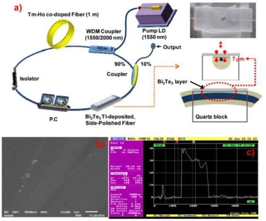 (a) The laser schematic. (b) Measured SEM image of the mechanically exfoliated, thick Bi2Te3 layer. (c) Bi2Te3 layer depth measurement result using an alpha step profiler. Reprinted with permission from [66].