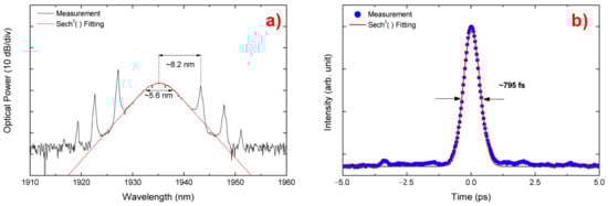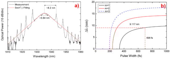 The period of the laser pulses was measured as 35.8 ns, which corresponds to a repetition rate of 27.9 MHz, being compatible with the fundamental frequency of the ring cavity. A strong signal peak with a peak-to-background ratio of 76 dB was observed at the repetition rate of 27.9 MHz in the electronic spectrum analysis. The optical spectrum measurement showed that the output pulses has a center wavelength of 1935 nm and a 3 dB bandwidth of 5.64 nm (Figure 12). If it is a transform-limited case, the pulse-width would be 698 fs. Kelly sidebands were clearly observed in the spectrum [67] in which the first-order Kelly sideband was at a distance 8.2 nm from the center wavelength. Using the experimentally measured total cavity dispersion value of 0.458 ps2, the position of the first-order Kelly sideband was theoretically calculated as 9.117 nm relative to the center wavelength, assuming the transform-limited case. Figure 12b shows the theoretical plot of a relative Kelly sideband position as a function of the temporal width of transform-limited pulses for various Kelly sideband orders.
