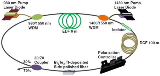 Lee et al. demonstrated that pulse-width-tunable, a mode-locked fiber laser through dissipative soliton resonance could be manufactured using a highly stacked Bi2Ti3 TI to emphasize its prominent potential in SA applications [75]. For this operation, a ring-cavity fiber laser system was constructed consisting of a 6-m-long Er-doped fiber (EDF), 980/1550 nm and 1480/1550 nm WDMs, a polarization controller, an optical isolator, 1480-nm and 980-nm pump LDs, a 30:70 output coupler and most importantly a 100-m long dispersion compensating fiber (DCF) along with the incorporation of a highly stacked Bi2Te3 SA module (Figure 14). Compared to normal configuration of mode-locked lasers, two points are noticeable. First, for sufficient increase of output pulse energy, two laser diodes with the wavelength of 1480 nm and 980 nm were used and their maximum pump powers were 82 mW and 298 mW, respectively. Second, a 100-m long DCF with a normal dispersion of −98 ps/nm km at 1550 nm was employed to enhance dissipative soliton resonance while suppressing the conventional soliton evolution. The power of the 1480-nm LD was gradually increased up to the maximum amount of 298 mW to launch the pump power while keeping the 980-nm LD switched off, and subsequently the 980-nm LD was switched on to further increase the pump power to supply a sufficient power to the gain fiber.