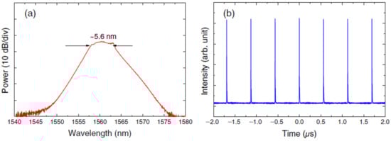 (a) Measured optical spectrum and (b) oscilloscope trace of the output pulses at a pump power of 88 mW. Reprinted with permission from [75].