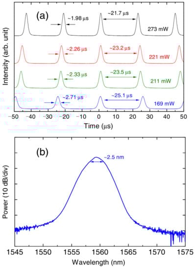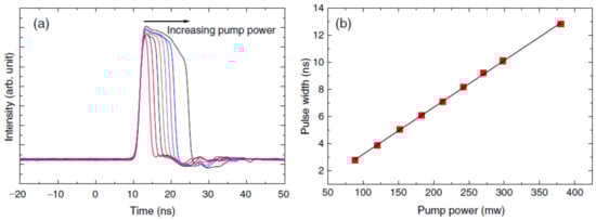 (a) Measured single pulses with an increasing pump power. (b) Measured output pulse width as a function of the pump power. Reprinted with permission from [75].
