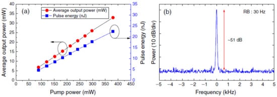 (a) Average output power and pulse energy measurements as a function of the pump power. (b) Measured electrical spectrum of the output pulses. Reprinted with permission from [75].