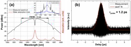 (a) Measured optical spectrum and (b) autocorrelation trace of the laser system. Reprinted with permission from [79].