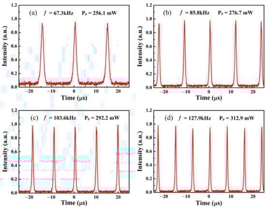 Passive Q-switching pulse trains of orange-light Pr3+-doped all-fiber laser based on WS2 SA under different incident pump powers of Pp. (a) Pp = 256.1 mW, (b) Pp = 276.7 mW, (c) Pp = 292.2 mW and (d) Pp = 312.9 mW. Reprinted with permission from [84].