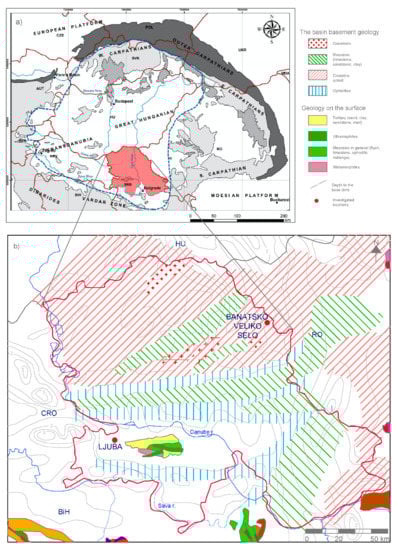 (a) Main tectonic units of the Alpine Fold Belt and Alpine–Carpathian–Dinaric Mountains (modified after [28]); (b) Geological map of the Vojvodina part of the Pannonian basin basement (modified after [29]).