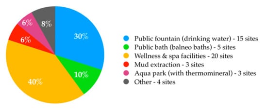 Geothermal energy is recognized as a valuable resource having a variety of uses: from electricity generation (through geothermal power plants or through cogeneration systems) [1] and space heating and cooling (using the heat pumps) to direct use in a wide range of applications in areas such as balneotherapy [2,3], agriculture, industry, swimming pool heating, and in individual and district heating systems [4,5]. While harnessing geothermal energy for electricity production is mainly related to specific tectonic regions, its direct use is more common. Coupling the energy potential with the healing properties of water’s temperature and chemical composition, is recognized as a versatile and efficient way of exploiting this geothermal resources [6,7,8,9].