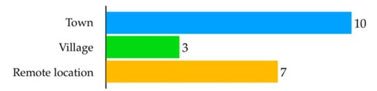 The urban context was classified as “town” for sites within small urban settlements, “village” for those within rural settlements, and “remote” for those the farthest away from existing settlements (Figure 3). The fact that remote sites have no infrastructure and the ones in the villages are often poorly equipped stressed the necessity of providing a high level of infrastructure independence.