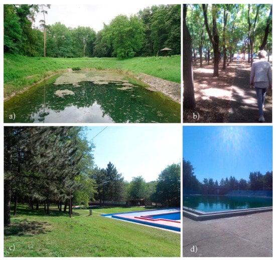 (a) Ljuba—currently an undeveloped site although used in Roman era; (b), Banatsko Veliko Selo—paths to outdoor pools (c,d) Banatsko Veliko Selo—outdoor swimming pool (existing facility).