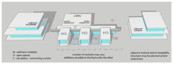 The general concept was developed with south-facing wellness and spa/medical units and corresponding utility spaces in the centre with optional additions of hospitality and medical facilities (Figure 7). However, adjacent medical and hospitality facilities might be planned with program-specific design strategies, so they were not further discussed in detail at this stage of the research.