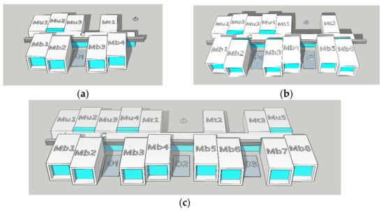 Stage 1 (Figure 8a) comprises of 4 balneotherapy units Mb1–Mb4 with 3 additional utility modules Mu1–Mu3 for reception, changing rooms, office, examination room and café, and an unheated module Mt1 as the mechanical room. Stage 2 (Figure 8b) is conceived as an expansion of Stage 1 with 2 added balneotherapy units Mb5–Mb6, an additional utility module Mu4 and an additional technical module Mt2. The third stage (Figure 8c) presents a further extension with balneotherapy modules Mb7–Mb8, additional utility module Mu5 and technical module Mt3. An overview of the basic data for all three stages is given in Table 2.