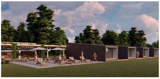 Design premises were in line with UN sustainability goals [30], where sustainable and resilient architecture for healthcare and spa facilities was conceived as the driver for a circular economy and improved well-being of the local population. The design approach was tailored with regard to the urban environment, the facility’s current development status, need for (and availability of) accommodation, and seasonal sensitivity. The study of such a size was also seen as an opportunity to explore options for “branding” the wellness and spa/medical facilities of Vojvodina through recognizable design features.