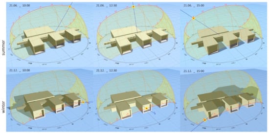Solar exposure and shading: all glazed surfaces of wellness modules and circulation volume are fully shaded during the summer to prevent overheating (upper row) while remaining almost completely exposed during winter (lower row), enabling direct passive solar gain.