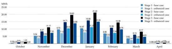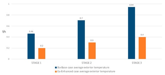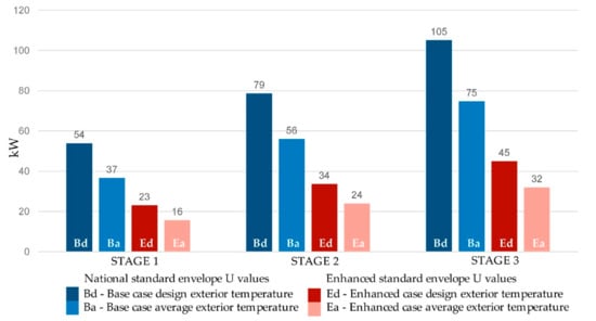 The monthly heating energy demands for all six scenarios is shown in Figure 13. It can be observed that the values of “enhanced case” for one stage almost correspond to the values of “base case” for a smaller stage. Stage 3 enhanced case is lower than Stage 2 base case and Stage 2 enhanced case is just slightly above Stage 1 base case (lower in March). These findings indicate that the heating system and materialization should be chosen to correspond to seasonal sensitivity and the anticipated capacity of the final stage to achieve a balance between the initial costs and the effects throughout the facility’s lifespan.