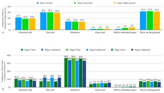 - The share of the components’ surface area in the overall thermal envelope area remained mostly constant throughout the development stages (Figure 15a). The ratio between the opaque and glazed elements was approximately 3:2 in all three stages, and the only component that showed a significant increase was the interior wall-to-unheated space as unheated technical modules are added.