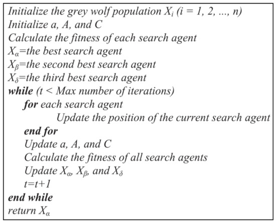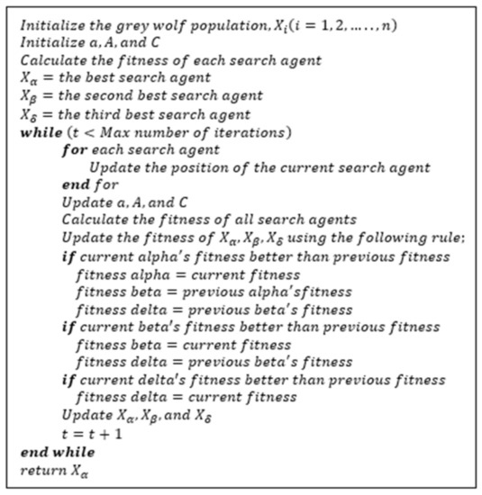 Overall, the process starts with initializing the random population of the Grey Wolf (candidate solution). Alpha, beta, and delta wolves estimate the prey’s probable position throughout the iteration. Each wolf updates its distance from the prey based on alpha, beta, and delta. The pseudo-code of the GWO algorithm is depicted in Figure 2.