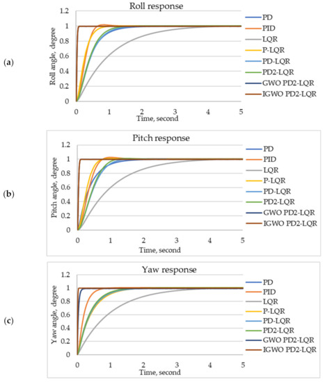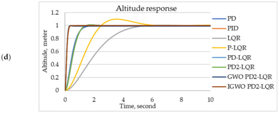 From this point of view, a comparative study with the conventional controller, namely PD, PID, LQR, P-LQR, PD-LQR, PD2-LQR controller, and the original GWO based PD2-LQR controller was undertaken. Four PD2-LQR controllers were designed for altitude (z) and attitude (roll, pitch, and yaw) motion. The conventional controllers’ parameters were manually optimized using the trial and error method, while the parameters of the PD2-LQR controller were optimized by using the traditional GWO and IGWO algorithms.