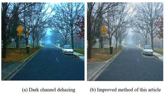 As we can see from Figure 3a, after using the dark channel prior to removing the fog, there are obvious edge effects on the tree periphery, the car outline, the signboard periphery, and the road side. At the same time, there is also obvious color cast. However, after using the improved method of this paper to remove the fog, it can be seen from Figure 3b, the edge effects of trees, cars, signs, and roadsides have been greatly improved, and the color of the image is natural.