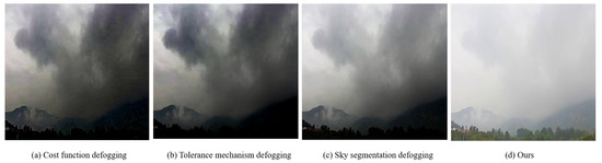 The improved algorithm is compared with the sky defogging algorithm based on cost function [16], sky defogging algorithm based on tolerance mechanism [12] and defogging algorithm [15] based on sky segmentation, and Figure 5 illustrates the comparison figures.