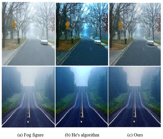 The first image and the second image in Figure 6b are defogged images obtained by using He’s algorithm [11]. The overall color of images has a large chromatic aberration phenomenon. At the same time, an obvious edge effect appears in the tree outlines, the car peripheries, and on the signboards and the roads. This is mainly because the atmospheric light value in He’s defogging algorithm is not appropriate. When there is a large white object in the image, the method incorrectly estimates the atmospheric light value. This will cause an inaccurate transmittance estimation and eventually cause an edge effect.