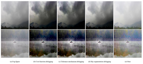 Furthermore, the two scenes in Figure 7 are a large sky area and a large reflective water surface. The first and second images in Figure 7b are defogged images obtained by using defogging algorithm based on the cost function [16]. It can be seen from the two images that the fog becomes darker, resulting in less detailed information in the image after defogging. This is mainly because the defogging method based on the cost function does not emphasize the refinement of transmittance.
