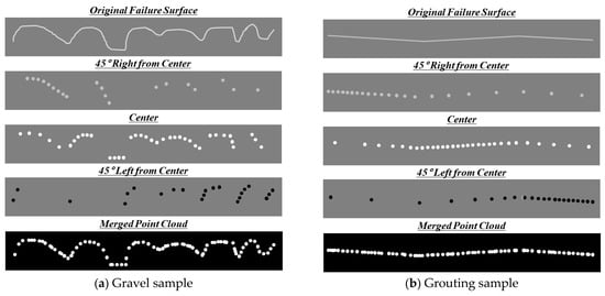 Figure 4 shows schematic diagrams of the expected point clouds of each sample at different scanning locations. Gravel sample is expected to have more shadowed effects. The overall roughness can be expressed by merging the point clouds collected at the front and sides due to the protrusion of gravels from the failure surface (see Figure 4a). Therefore, scanning at various angles is essential in gravel samples in order to evaluate the roughness appropriately. In the grouting sample, the resolution of point cloud of failure surface can be different depending on the scanning location. However, if there is a section in which the angle of the failure surface is changed sharply, this section can be expressed in more detail with multiple scanning at different locations (see Figure 4b). The grain size of sand is about 1 mm. Since the resolution of the laser scanning used in this paper is 0.3 mm and six scans were performed, the roughness caused by the sand grain can be detected on the failure surface of the sand sample. As shown in Figure 4c, the failure surface of the sand sample can be partially shaded by the locally curved area and the sand grain. Therefore, if point clouds are merged, not only an increase in resolution but also a local curvature can be detected.