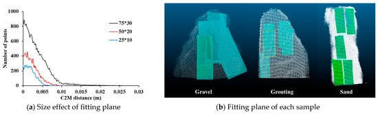 A software, Cloud compare, was used to perform the analysis of the point cloud (CLOUDCOMPARE, 2018 []). Since the front view of the failure surface of the point cloud is a rectangle with a vertical to horizontal ratio of about 10:4 on average, the fitting surface is simulated as a rectangle. Compared to the other two samples, the roughness of the gravel has to include both the local roughness and the curvature of the gravel so that the calculation of the fitting surface can affect the result. Therefore, as shown in Figure 7a, the analysis results were compared when the sizes of the fitting plane are 25 mm × 10 mm, 50 mm × 20 mm, and 75 mm × 30 mm. It can be seen that when the size of the fitting plane is 25 length and 10 width, the C2M distance is not changed within about 2 mm. If the fitting surface is small, the curvature of some part of the gravel can be simulated, but local roughness is not appropriately simulated. When the rectangular fitting face is 75 mm long and 30 mm wide, it shows that the local roughness and curvature of the gravel are expressed in the histogram within 10 mm. However, since the fitting surface is too large for the sample size, the convex protruding shape irrespective of the roughness of the failure surface affects the result. Therefore, it can be seen that the roughness is calculated even after the C2M distance is 10 mm. When the size of the fitting surface is 50 mm in length and 20 mm in width, it is not only reflected appropriately in the C2M analysis results of local roughness and gravel curvature, but it is also possible to collect a number of analysis samples from the failure surface. As shown in Figure 7b, the point clouds of the failure surface were cut into five rectangular shapes in each sample, and the cut surfaces were overlapped with each other in the cases of gravel and grouting samples due to small size of the failure surface. Fitting planes were created from the cut point clouds, and C2M distance can be calculated. Figure 7c shows the location of the fitting plane on the failure surface of the grouting sample and the distribution of points within the fitting plane. In the side view of the distribution of the points within the fitting plane, a uniform distribution pattern is shown without large curvature in the grouting sample. An example of a fitting plane at the failure surface of a sand sample and the distribution of points within the fitting plane are shown in Figure 7d. The points are distributed in a wavy shape relative to the fitting plane by the sand grains and the local curvature on the failure surface (see side view in Figure 7d). In the gravel sample, the sharp curves of the failure surface caused by the protrusion of the gravel and the area from which the gravel is separated from the failure surface are expressed as a distribution of points. Since the fitting plane is 20 mm wide and 50 mm long, the roughness due to gravel is also revealed in the side view. The global distribution of points is not only spread over the fitting surface, but also the points are distributed farther from the fitting plane in the local area than the other samples (see Figure 7e).
