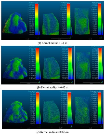 (3) The roughness detection method by the kernel is affected by the density of the point cloud, and hence the roughness analysis to define the effect of the point cloud density was performed. It is proposed that more than 5000 points need to be obtained within the cut point cloud to clearly distinguish the roughness.