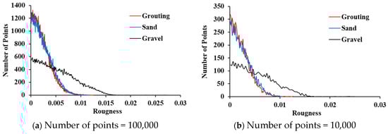 The analysis of point cloud is significantly influenced by the density of the points. If each point included accurate coordinate information, accurate analysis results can be obtained with a point cloud containing many points. However, the scanning and analysis time is increased with the increase of the number of points. In this paper, a kernel size of 0.05 m, which reflects the roughness of three samples properly, was used to analyze the calculation of roughness regarding the density change of the point cloud. Subsamples with 100,000, 10,000, 5000, and 1000 points were extracted from 135,000 original point clouds to evaluate the roughness, and compared with the roughness of the original point cloud. Figure 13a shows a histogram in which roughness was determined by subsamples with 100,000 points. There is no significant difference with the results of the original point cloud in Figure 11b. Table 1 shows the roughness at which the number of points reached 95% in each sample. All three samples with 100,000 points have an error of less than 0.6% compared to the results of the original sample. When the number of points is reduced to 10,000, the histogram is similar to the original point cloud (see Figure 13b). In the grouting, sand and gravel samples, the roughness at which the number of points reached 95% was 5.76, 6.05, and 1.19 mm. The roughness of the sand and gravel samples showed an error of about 2% compared to the results of the original point cloud. The fluctuation between the roughness classes in the histogram becomes larger if the number of points is decreased to 5000 (see Figure 13c). Therefore, the distribution of points in individual roughness classes of the histogram is unstable. The roughness at which the number of points in each sample reached 95% has an error of about 2% compared to the result of the original point cloud. In the results of 1000 points, the fluctuation of histogram is larger than the others and the slope of the histogram is steeper within a roughness class of 5 mm (see Figure 13d). The roughness at which the number of points in the gravel sample reached 95% is increased to about 4% compared to the result of the original point cloud. The histograms of grouting and sand samples cannot be distinguished as well.