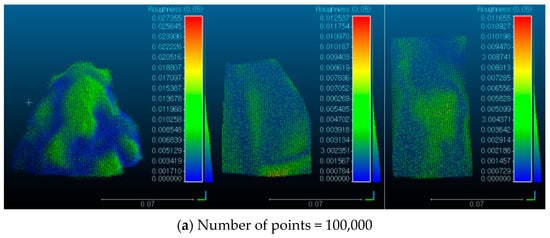 Figure 14 shows the result of the point cloud roughness in color scale for each point. In the case of 100,000 points, it is similar to the color scale result of the original point cloud, as shown in Figure 14a. If the number of points is reduced to 10,000, the locations with high roughness are still same as the results of the original point clouds (see Figure 14b). When the number of points is decreased to 5000, the distribution of points becomes sparser. In the failure surface, the intensity of the color scale representing the roughness of the protrusion of the gravel in the gravel sample, and the angled failure surface in the grouting sample is decreased with the decrease of points (see Figure 14c). The roughness is reduced compared to the result of the original point cloud because the kernel is redefined by the reduced points. Figure 14d shows the results of 1000 points, and the color scale of roughness is further reduced. The location of the kernel for detecting the roughness is changed by the sparse point cloud. The elevation between the kernel and points is more reduced by the changed kernel. Therefore, the roughness scale is decreased with the decrease of the points, which means that the roughness cannot be expressed in detail under low density conditions.