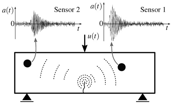 When a mechanical system is excited by an external source or undergoes changes in its internal structure, it presents local instabilities (events) that propagate as mechanical waves. These Acoustic Emission (AE) signals are usually accelerations with frequencies ranging from to [13]. These signals are detected by accelerometers that are mounted on the structure’s surface, as depicted in Figure 1, where the excitation is usually a force or prescribed displacement in time.