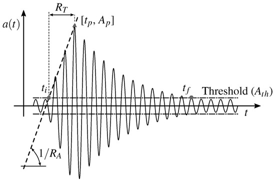Figure 2 illustrates a typical AE signal. Several parameters can be extracted from these signals [13], but the ones of interest here are: maximum Amplitude (), signal threshold (), initial time (), and final time (), where both times are functions of the fixed threshold level. The Rise Time () is defined as , i.e., the difference between the instant of maximum amplitude () and the moment when amplitude rise from threshold levels was first detected. From these data, the Rise Angle () is given by . Finally, the area under the signal is also of interest, because it bears a direct relation with the acoustic energy emitted during the event, as explained in detail in [14].