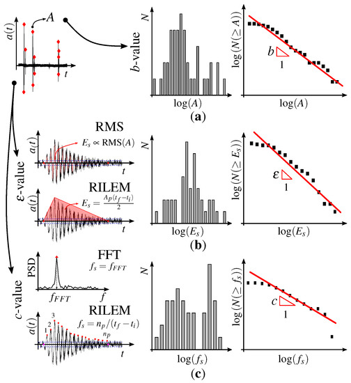 - Relation between the number of events N and the signal amplitude A: this relation has been long used in seismological applications, as illustrated by the classic Gutenberg & Ritcher law [4], which is of universal nature and it does not depend on the scale of the distribution [11,15,16]:where N is the cumulative number of signals and A is the signal amplitude. The physical meaning is discussed in [17,18,19]. It is hypothetically related, according to the expression , to the fractal dimension of the material domain from which the signals that are generated by cracks are emitted. When the damage process begins within a structure, signals are emitted from a micro-cracks roughly evenly distributed in the material volume, i.e., and . Thus, according to Equation (1), most events produce small-amplitude signals. As damage advances, localization effects take place, and the signals are preferentially emitted from micro-cracks that distribute on preferential surfaces, which results in macro-crack nucleation. Therefore, in this last phase, the values for and b become 2 and 1, respectively, and the application of Equation (1) yields an increase in the number of large-amplitude events. Thus, the evaluation of b and how it changes with time allows for one to keep track of damage processes.The procedure for computing b is schematically described in Figure 3a. The amplitudes due to each signals are collected and organized in a histogram. Subsequently, a bi-log diagram is built to illustrate the cumulative number N of signals with amplitude . Finally, b is the angular coefficient of the fitting line. For a more detailed discussion about this computing procedure, see [20].
