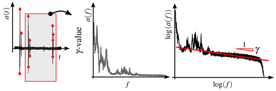 - Frequency fluctuations during the damage process: a well-known measure of energy fluctuations in AE signals relies on their dependence on signal frequency, as described by the spectral density function (SDF), as mentioned by [24]. The first observations regarding this dependence are reported by [25], who coined the term -noise or Flicker Noise when studying the noise effects in electronic circuits. According to [26], the dependence of noise energy distribution with respect to frequency is given by:where is the energy emission, f is the signal frequency, while and a are the scalar fitting coefficients. Taking the logarithm of both sides in Equation (4), the best fitting line leads to a linear law, where gamma is the angular coefficient. Its calculation is schematically described in Figure 4.