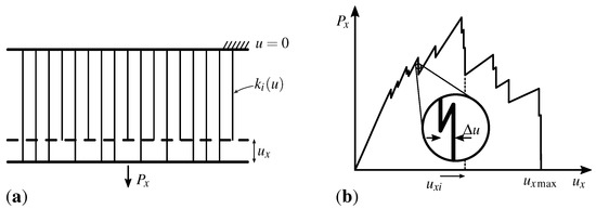 To the authors’ knowledge, the most relevant application of this method is the one by Sornette (1989) [39], which uses it as a tool to represent the behavior of solids undergoing damage processes. A comprehensive discussion of the Bundle Model and its applications is presented in the book by Hansen et al. (2015) [11]. Its simplest version is the Equal Load Shared Bundle Model (ELS Bundle Model), which comprises a set of parallel fibers (Figure 5a) with both ends fixed to a rigid frame. Each fiber is assumed to have elastic behavior until reaching its respective failure strength, which is given by a known statistical distribution. Figure 5b presents the typical load vs prescribed displacement for this setup. In the classical paper by [15], it is shown that, when a continuously increasing displacement is prescribed to the set of fibers (i.e., the set is continuously stretched by infinitesimal increments), the distribution of number of broken bars is given by an exponential function with a universal exponent of , regardless of the specific distribution of failure strength in the fibers.