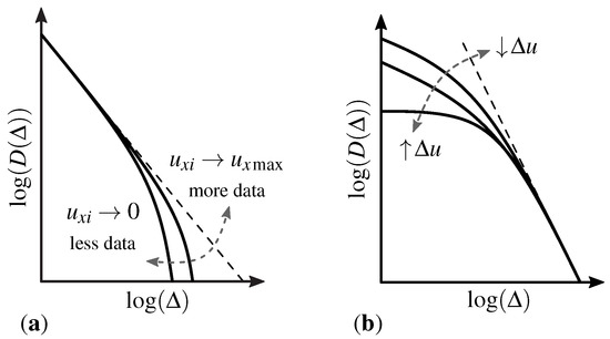 The ELS Bundle Model also predicts two forms of distributions that deviate from the aforementioned universal one, as shown in Figure 6 [11]. The first deviation takes place when the prescribed displacement is continuously increased only to a value , i.e., the loading process is interrupted before the critical displacement for complete failure is reached. In this case, since the available data do not reflect the entire failure process, the model’s predictions deviate from the universal distribution, as shown in Figure 6a. The second form occurs when the prescribed displacement occurs in discrete steps. Now, each step is large enough to cause failure of several fibers at once, causing the prediction curve to draw away from the ideal straight line at the top left of the graph, as shown in Figure 6b.