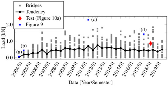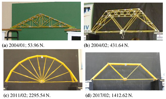 The collapse loads for all bridges evaluated in the contest are informed in Figure 8, with four winning designs being highlighted in the same figure and depicted in Figure 9. It is noticed that the average collapse load increases for the first six years, tending to an approximately constant value after that. This is due to the increased tendency of most contestants to adopt the topology that is depicted in Figure 9c, which is theoretically optimal for stiffness [43].